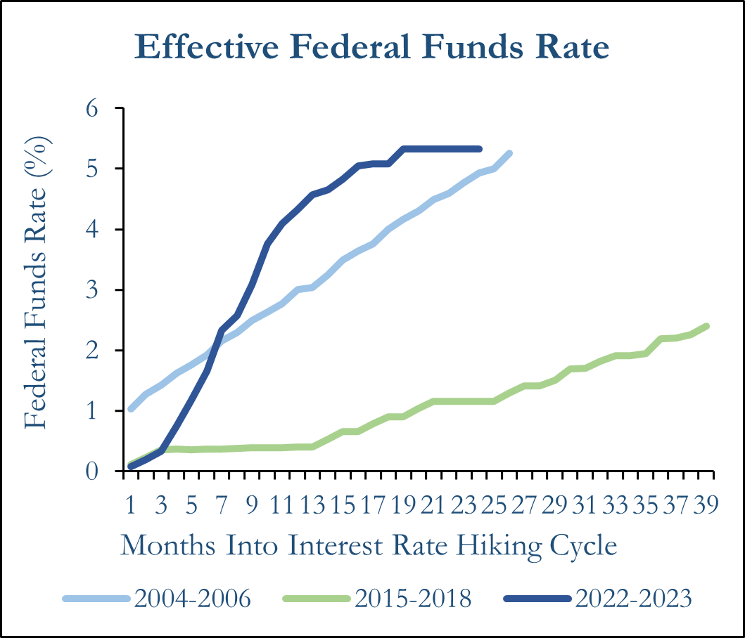 The Federal Funds Rate reached 5.25%-5.50% in July 2023. Source: FRED