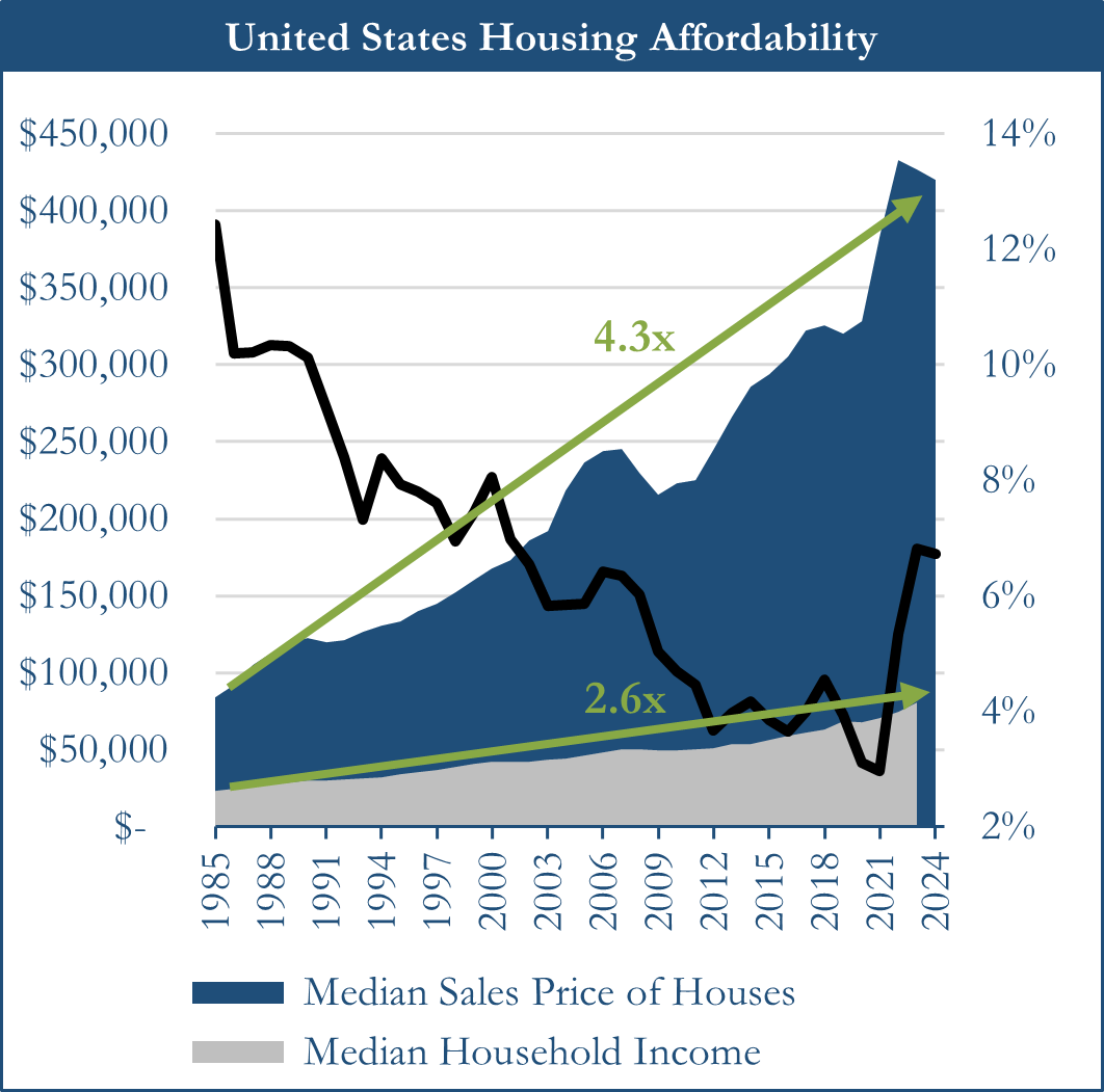 Over the past 20 years, the United States’ population has grown by more than 43 million individuals and future growth projections remain strong [2]. Despite the growing population, the country has underbuilt housing by several millions of homes over the last 15 years which has significantly impacted housing affordability. Furthermore, exponential growth in home prices has priced many individuals out of homeownership as household income growth has dramatically lagged the increase in home prices. Elevated mortgage rates have created an additional challenge for buyers as they are required to bear a higher monthly cost to own their home.