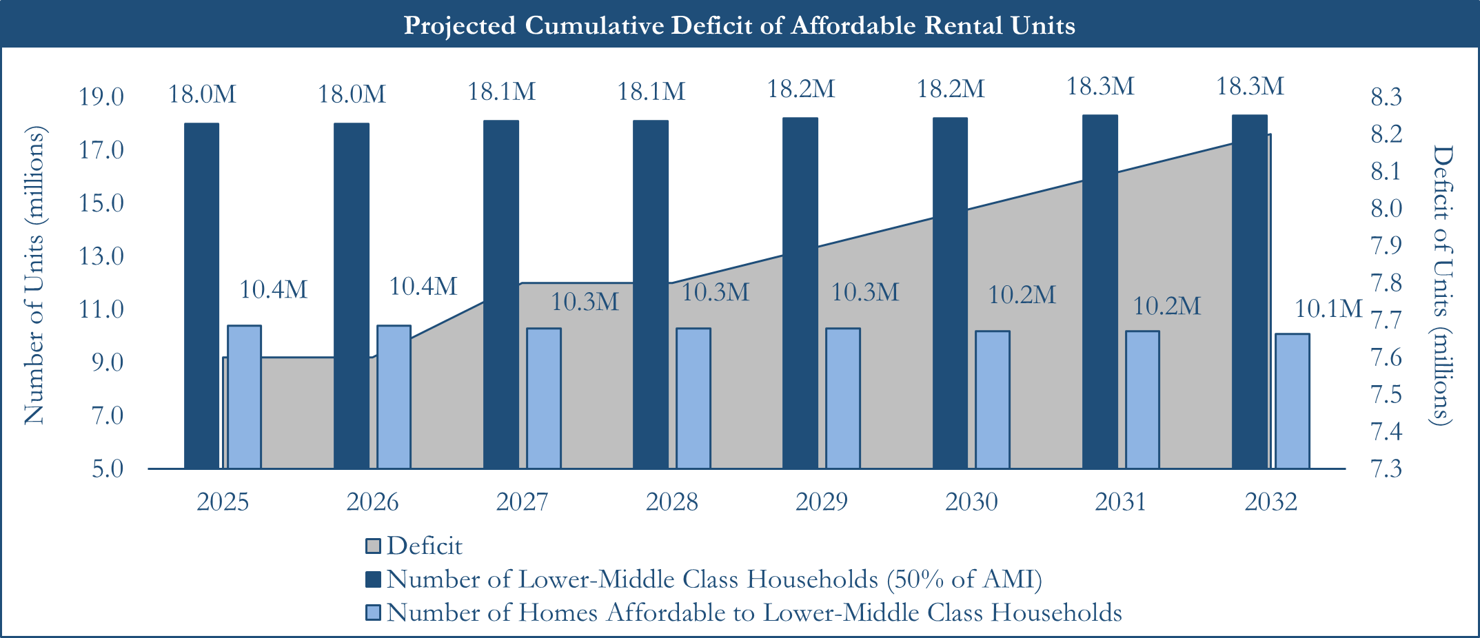 Due to expiration of rent restrictions, obsolescence and underproduction, the deficit of 7.4 million affordable units available to low- and extremely low-income households is projected to increase to a national shortage of 8.2 million units by 2032 [11].