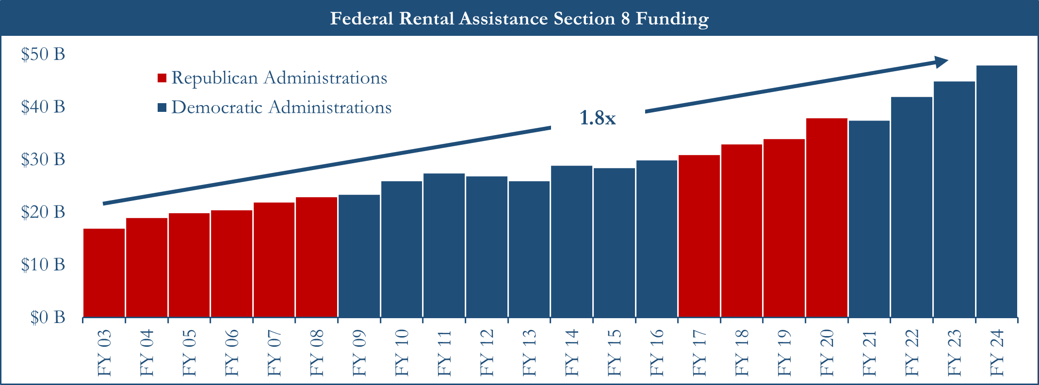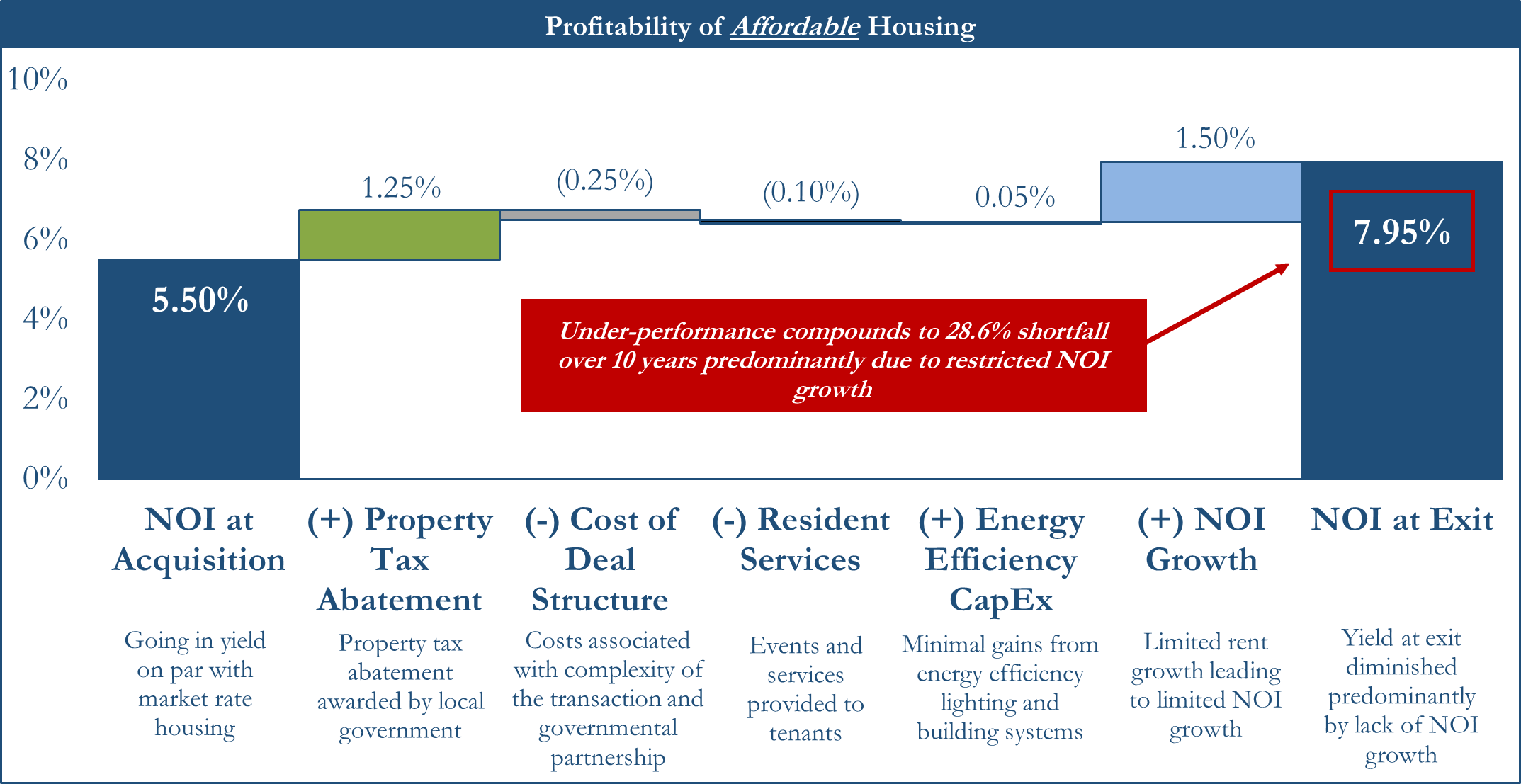 One of the primary economic drivers of interest in Affordable housing investments is the “stickiness” of the tenants as many have dedicated years to obtaining a voucher and are reluctant to move. Because of this, the assets are often considered to have consistently strong occupancy. Governmental assistance is also frequently marketed as an additional boost to investment returns. However, the profitability of Affordable housing investments is significantly below its market rate counterpart as governmental incentives do not substitute market rate rental growth over the hold period of an asset.