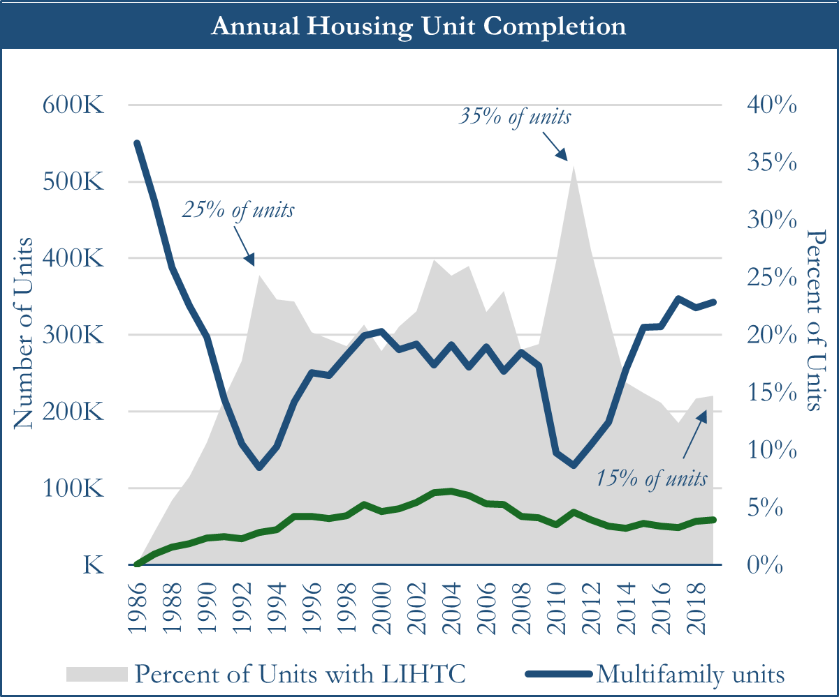 The Low-Income Housing Tax Credit (“LIHTC”) program, which was enacted as part of the Tax Reform Act of 1986, has been the most effective policy to increase the supply of affordable housing. The public/private partnership is a tax credit that subsidizes a portion of the costs associated with acquisition, construction and rehabilitation of affordable rental housing and supports the construction or rehabilitation of approximately 110,000 affordable rental units each year [12]. LIHTC has assisted in the creation of more than 4 million units and has served more than 9 million households since its inception [13]. With the significant rise in development costs in conjunction with an estimated 350,000 LIHTC units expiring by 2030 [14], it is becoming increasingly difficult to add more affordable supply.